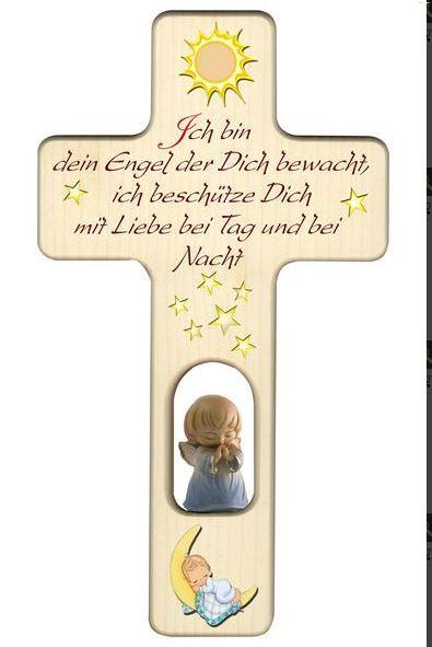 Taufgeschenk Kinderkreuz mit geschnitzten Engel betend." Ich bin dein Engel" Das Kreuz ist mit Sonnenmotiv, Sternen und Mond in dem sich ein kleines Baby anschmiegt und einem schönen Kindergebet bedruckt.