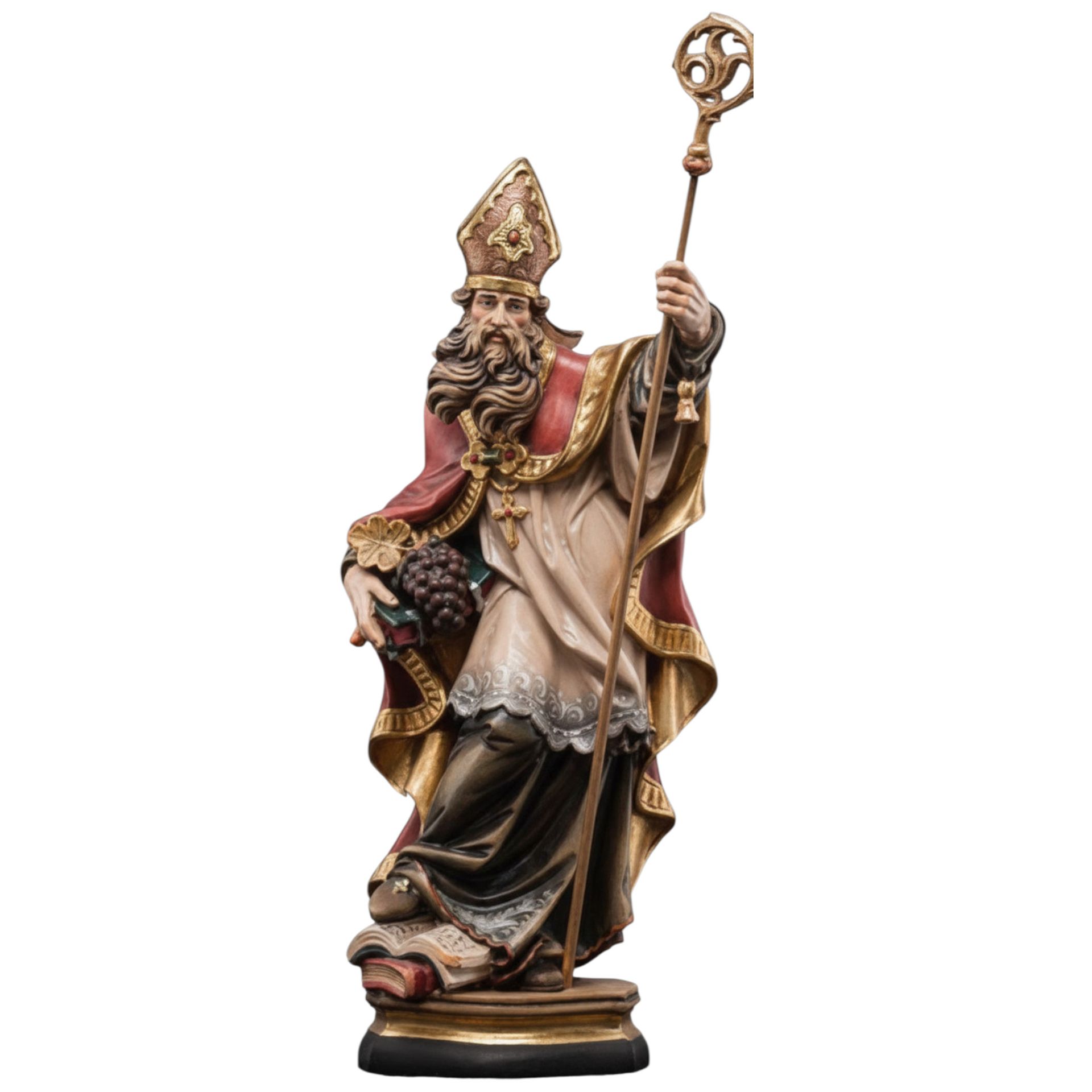 Heiliger Urban mit Trauben aus Ahorn oder Lindenholz geschnitzt. Sie können die verschiedenen Oberflächen - Ausführungen der Figur sowie die Größen auswählen. Diese Holzfigur ist kurzfristig lieferbar. Holzfiguren bis zu einer Größe von 39 cm weden aus Bergahorn geschnitzt, ab 40 cm werden Figuren aus den weicheren Lindenholz geschnitzt und müssen aufwendiger nachgeschnitzt werden. Heiligenfiguren und Holzschnitzereien werden auch heute noch nach traditionellen Techniken hergestellt . Alle Figuren werden maschienell vorgefräst und von Hand nachgearbeitet. Nur so können die Figuren bezahlbar produziert werden. Bemalte Holzfiguren werden mit hochwertigen Ölfarben von Hand veredelt und teilweise mit Blattgold belegt. Gerne fertigen wir für Sie einen Sockel mit Wunschgravur