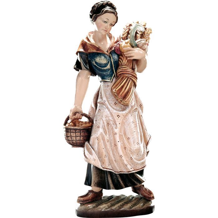 Holzfigur der Heiligen Notburga mit Brotkorb sehr kunstvoll und detailreich aus Ahornholz geschnitzt. Heiligenfiguren und Holzschnitzereien werden auch heute noch nach traditionellen Techniken hergestellt . Alle Figuren werden maschienell vorgefräst und von Hand nachgearbeitet. Nur so können die Figuren bezahlbar produziert werden. Bemalte Holzfiguren werden mit hochwertigen Ölfarben von Hand veredelt und teilweise mit Blattgold belegt.