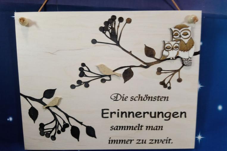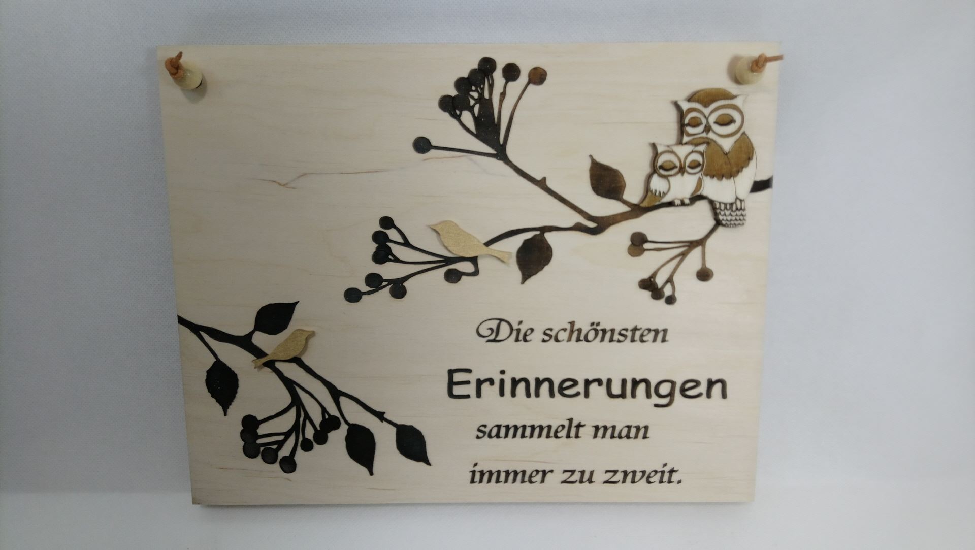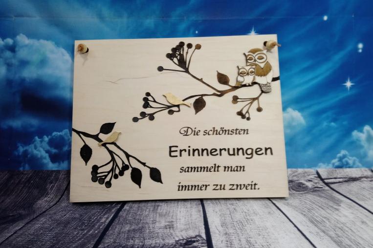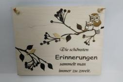 Holztafel .Die schönsten Erinnerungen sammelt man immer zu zweit als dekorativer Wandschmuck Maße der Holztafel ca. H 16 cm - Breite 200 cm, Dicke 15 mm Holzschild mit Vögel und Eulenpaar