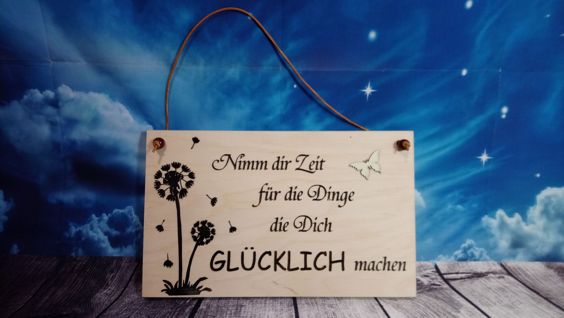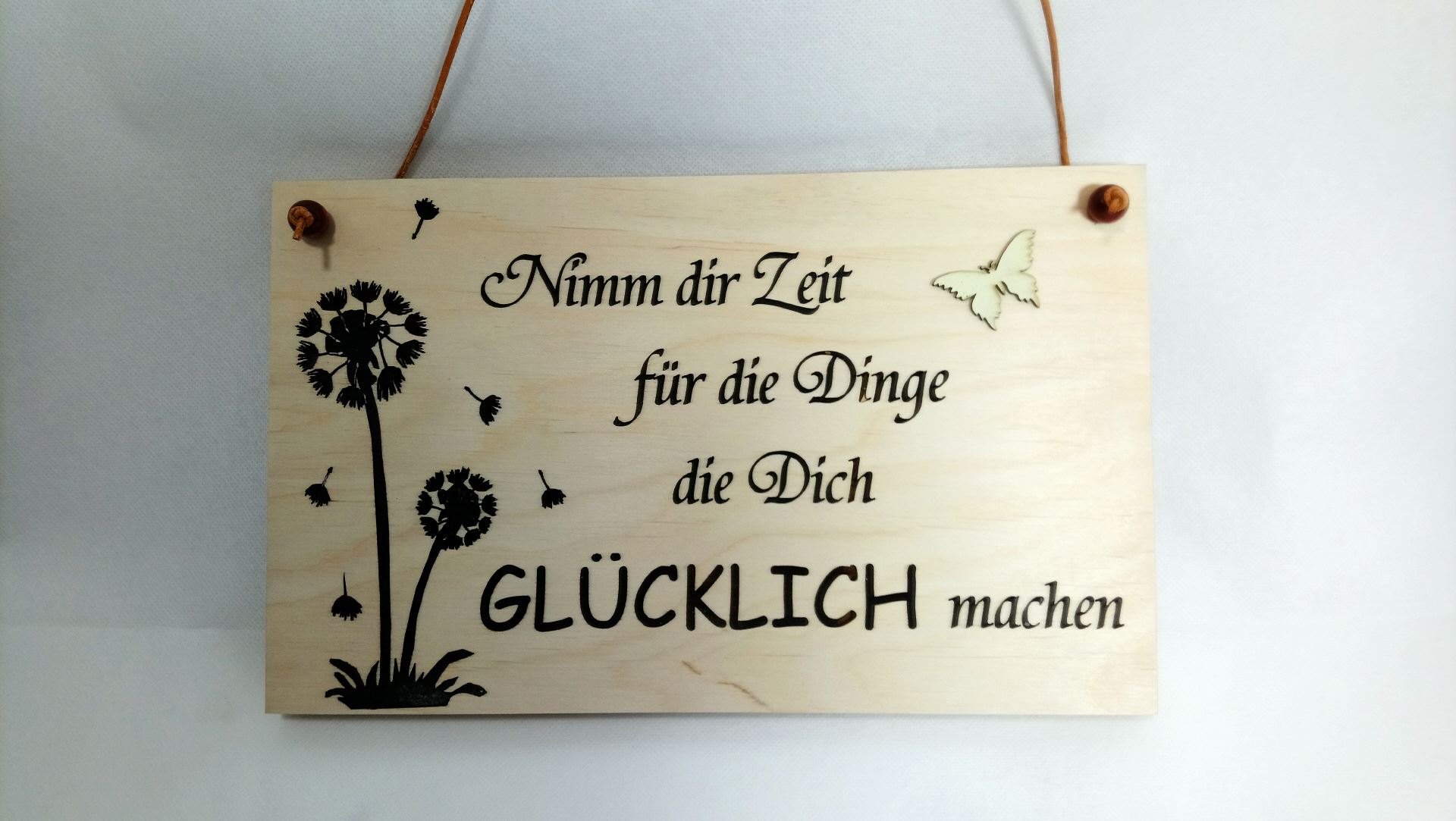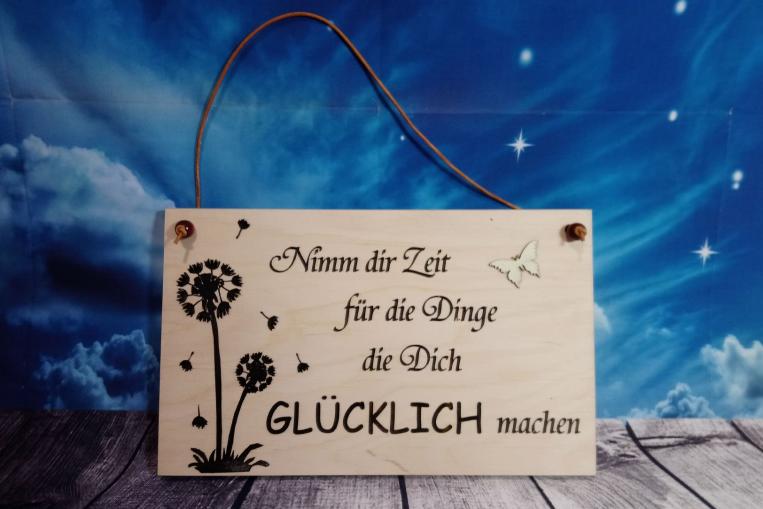 Holztafel „Pusteblume“ als dekorativer Wandschmuck Maße der Holztafel ca. H 16 cm - Breite 200 cm, Dicke 15 mm Holzschild Nimm dir Zeit für die Dinge die dich glücklich machen Holzbild zum aufhängen mit gravierten Spruch
