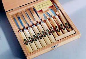 Dieser Satz besteht aus Art:3201:8 mm Art.3202:10 mm Art.3208: 6,8 mm Art.3239: 6 mm Art.3247: 2 mm Kerbschnitzbeiteln und Art. 3351, 3353, 3356, 3358, 3707: 80x30 mm Kerbschnitzmessern von KIRSCHEN und einem kombinierten Schleifstein zum Schärfen und Abziehen der Schneiden, gut verpackt in einem attraktiven Holzkasten.