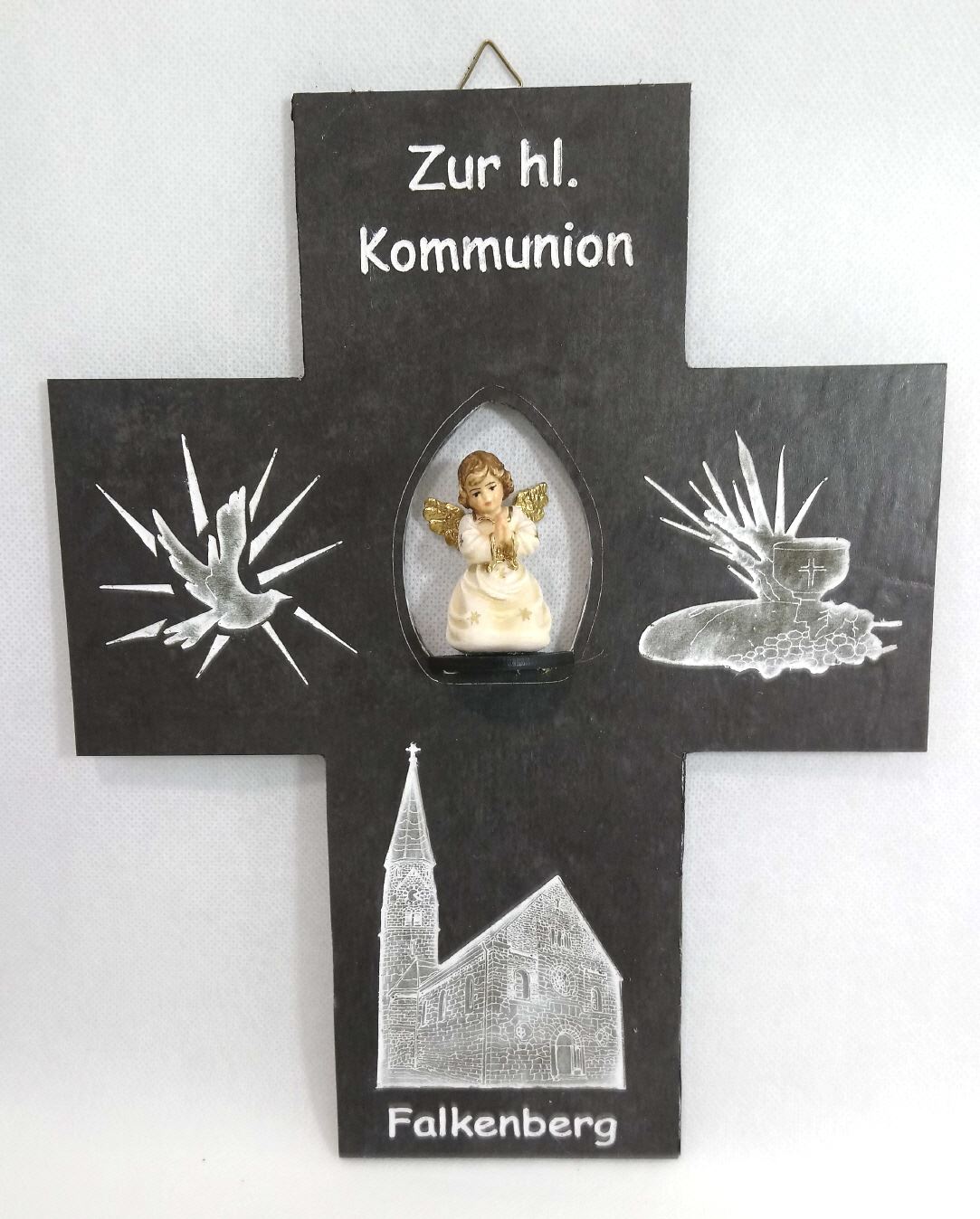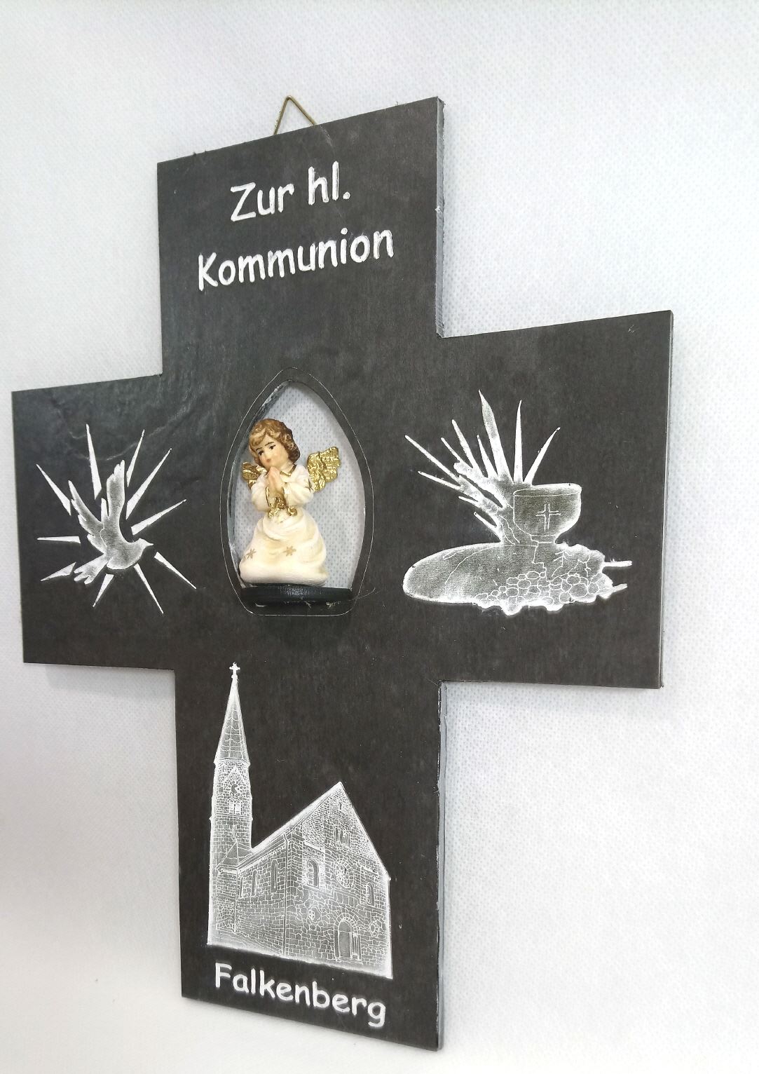 Modernes Kommunionkreuz aus hochwertigen Vinyl und geschnitzten Engelchen. Ein modernes Kommunionkreuz in Schieferoptik mit eingeprägten individuellen Texten und Motiven, Der geschnitze Engel betend ist mit weißen Gewand ist aus Ahornholz geschnitzt und mit Ölfarben handbemalt links zu sehen ist die Friedenstaube, rechts eine Abbildung mit Kelch, Brot und Getreide, und im unteren Teil wurde die Pfarrkirche St. Pankratius Falkenberg eingraviert, in der Mitte steht ein betenderr Kommunionengel. Wir benötigen folgende Angaben: -Name des Kommunionkindes -Datum der Erstkommunion -Ortsnamen