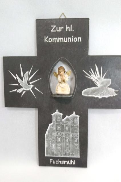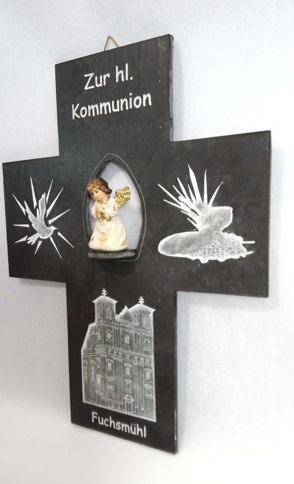 Modernes Kommunionkreuz aus hochwertigen Vinyl und geschnitzten Engelchen. Ein modernes Kommunionkreuz in Schieferoptik mit eingeprägten individuellen Texten und Motiven, Der geschnitze Engel betend ist mit weißen Gewand ist aus Ahornholz geschnitzt und mit Ölfarben handbemalt links zu sehen ist die Friedenstaube, rechts eine Abbildung mit Kelch, Brot und Getreide, und im unteren Teil wurde die Walfahrts Kirche Fuchsmühl eingraviert, in der Mitte steht ein betenderr Kommunionengel. Wir benötigen folgende Angaben: -Name des Kommunionkindes -Datum der Erstkommunion -Ortsnamen