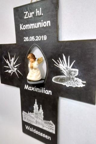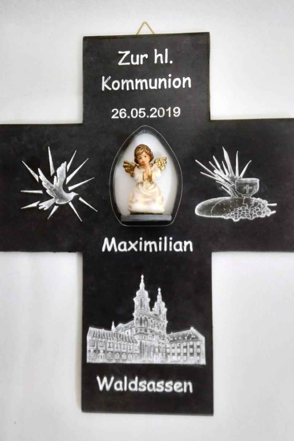 Modernes Kommunionkreuz aus hochwertigen Vinyl und geschnitzten Engelchen. Ein modernes Kommunionkreuz in Schieferoptik mit eingeprägten individuellen Texten und Motiven, Der geschnitze Engel betend ist mit weißen Gewand ist aus Ahornholz geschnitzt und mit Ölfarben handbemalt links zu sehen ist die Friedenstaube, rechts eine Abbildung mit Kelch, Brot und Getreide, und im unteren Teil wurde die Basilika Waldsassen eingraviert, in der Mitte steht ein betenderr Kommunionengel. Wir benötigen folgende Angaben: -Name des Kommunionkindes -Datum der Erstkommunion -Ortsnamen