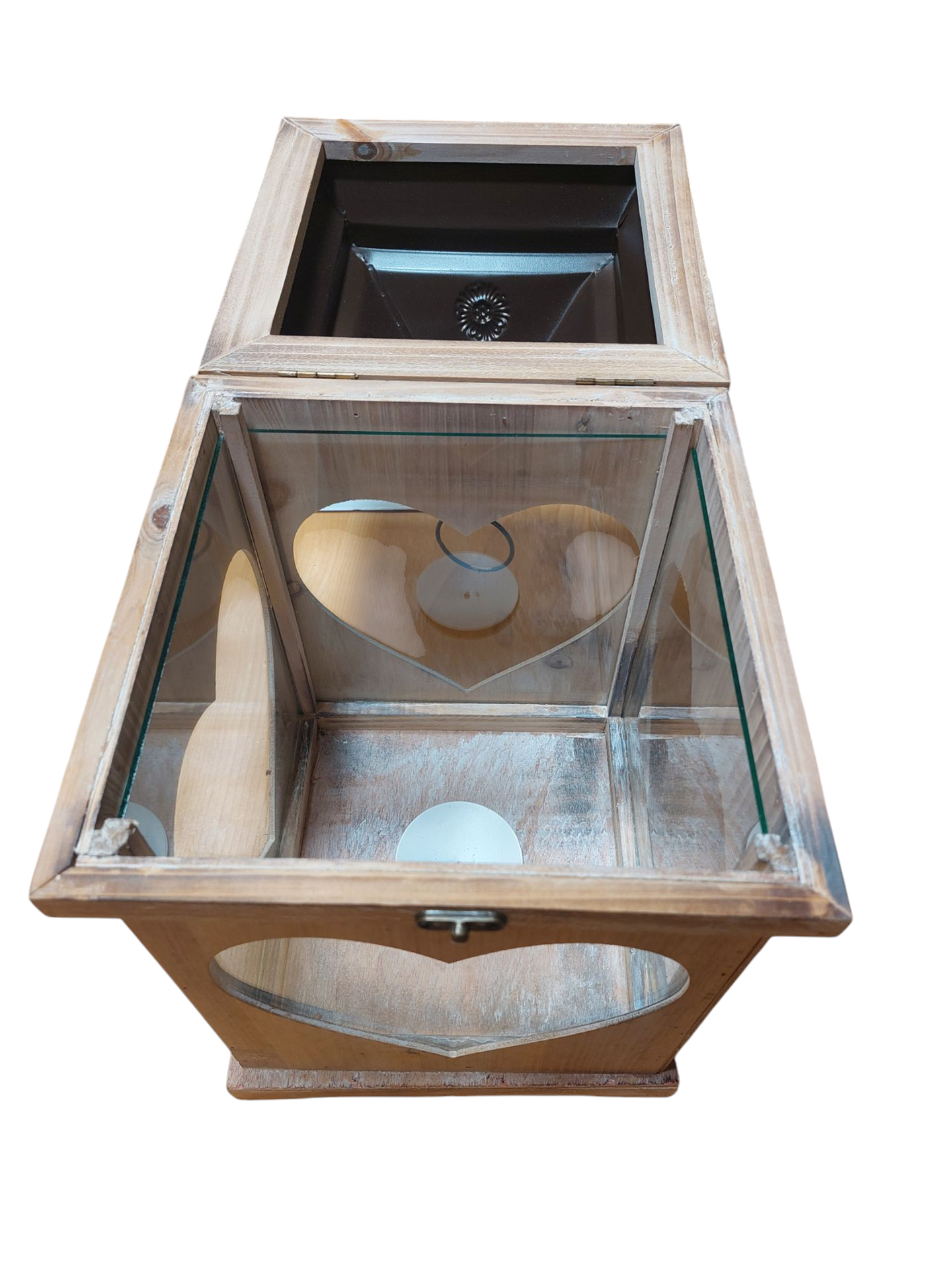 Die Herzlaterne vereint robustes Massivholz, Eisen und Glas in einem einzigartigen Design. Die kunstvollen Verzierungen sind nicht nur ein Augenschmaus, sondern auch funktional: Sie bieten Platz für Teelichter und kleine Stumpenkerzen.