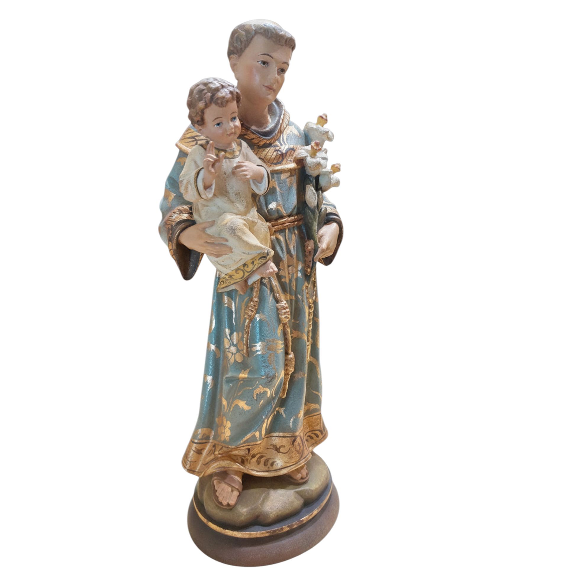 Der heilige Antonius trägt ein bläuliches Ordensgewand, das kunstvoll mit feinen Goldornamenten verziert ist. In seiner linken Hand hält er die Lilie, das klassische Symbol für Reinheit und Heiligkeit. Auf seinem Arm steht das Jesuskind, das ihm liebevoll zugewandt ist – ein traditionelles Motiv der Antonius-Darstellungen.