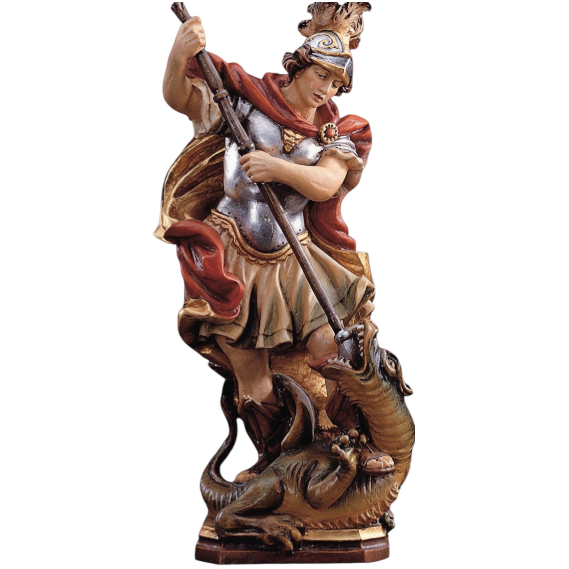 Hl. Georg der Drachentöter kunstvoll und detailreich aus Ahorn oder Lindenholz geschnitzt. Sie können die verschiedenen Oberflächen - Ausführungen der Figur sowie die Größen auswählen. Diese Holzfigur ist kurzfristig lieferbar. Holzfiguren bis zu einer Größe von 39 cm weden aus Bergahorn geschnitzt, ab 40 cm werden Figuren aus den weicheren Lindenholz geschnitzt und müssen aufwendiger nachgeschnitzt werden. Heiligenfiguren und Holzschnitzereien werden auch heute noch nach traditionellen Techniken hergestellt . Alle Figuren werden maschienell vorgefräst und von Hand nachgearbeitet. Nur so können die Figuren bezahlbar produziert werden. Bemalte Holzfiguren werden mit hochwertigen Ölfarben von Hand veredelt und teilweise mit Blattgold belegt. Gerne fertigen wir für Sie einen Sockel mit Wunschgravur