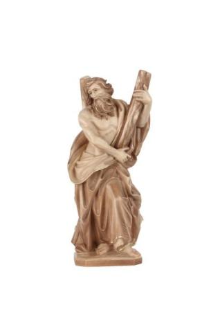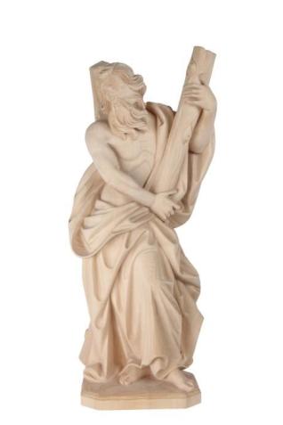 Heiliger Andreas mit gebogenen Kreuz sehr kunstvoll und detailreich aus Ahorn oder Lindenholz geschnitzt. Sie können die verschiedenen Oberflächen Ausführungen der Figur sowie die Größen auswählen. Diese Holzfigur ist kurzfristig lieferbar. Heiligenfiguren und Holzschnitzereien werden auch heute noch nach traditionellen Techniken hergestellt . Alle Figuren werden maschienell vorgefräst und von Hand nachgearbeitet. Nur so können die Figuren bezahlbar produziert werden. Bemalte Holzfiguren werden mit hochwertigen Ölfarben von Hand veredelt und teilweise mit Blattgold belegt. Gerne fertigen wir für Sie einen Sockel mit Wunschgravur Der Fischer aus Kapharnaum war einer der ersten Jünger Jesu. Rund um seinen Gedenktag ist ein vielfältiges religiöses Brauchtum entstanden. Auch Wetterregeln gibt es für den Andreastag, etwa: Wenn es an Andreas schneit, der Schnee hundert Tage liegen bleibt. Oder: Hält St. Andreas den Schnee zurück, so schenkt er reiches Saatenglück.