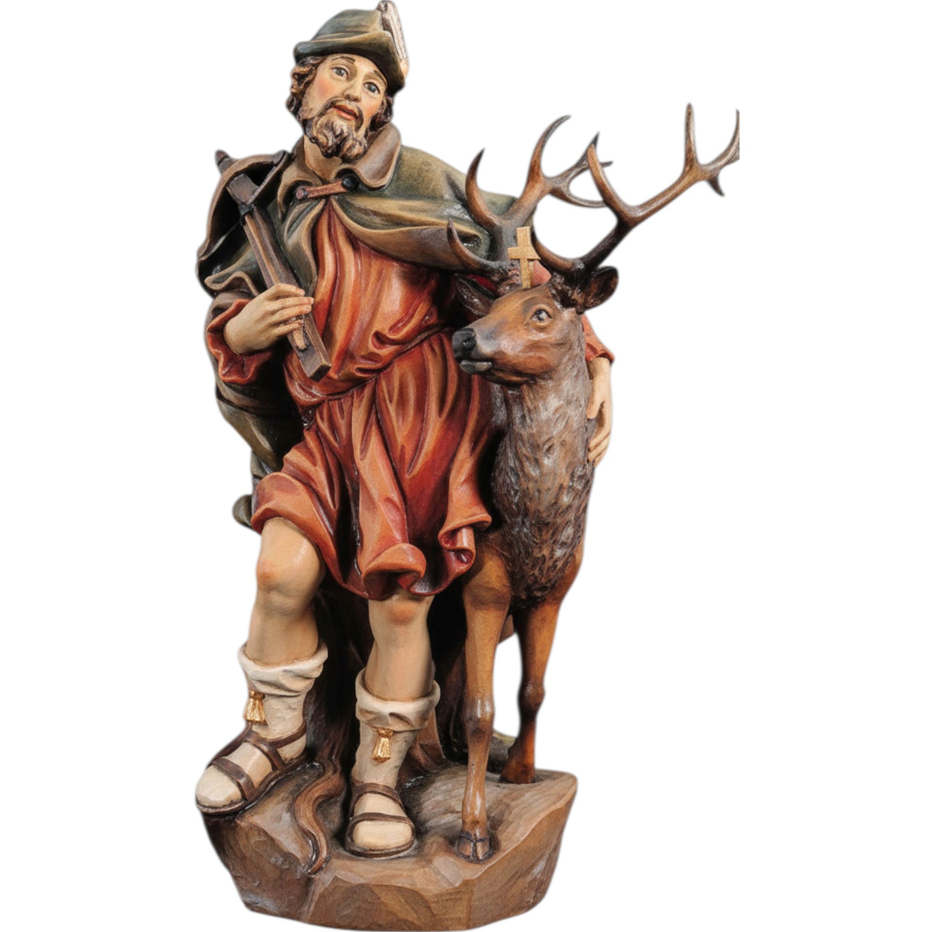 Hl. Hubertus der Jäger sehr kunstvoll und detailreich aus Ahornholz geschnitzt.Holzschnitzereien werden auch heute noch nach traditionellen Techniken hergestellt . Alle Figuren werden maschienell vorgefräst und von Hand nachgearbeitet. Nur so können die Figuren bezahlbar produziert werden. Bemalte Holzfiguren werden mit hochwertigen Ölfarben von Hand veredelt und teilweise mit Blattgold belegt. Gerne fertigen wir für Sie einen Sockel mit Wunschgravur Beispiel-Gravursockel