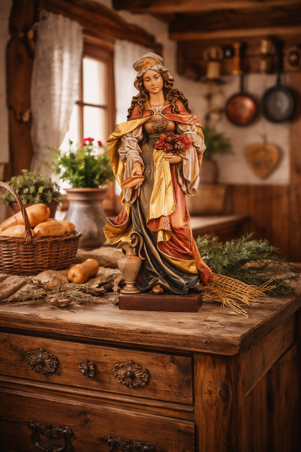 Die Figur ist holzgeschnitzt und detailreich ausgearbeitet, mit besonderen Attributen, die ihre Rolle als „Brotgeberin“ unterstreichen. Die traditionelle Holzschnitzkunst bringt fein gearbeitete Gewandfalten, eine warme Präsenz und eine ruhige Ausstrahlung zum Ausdruck.