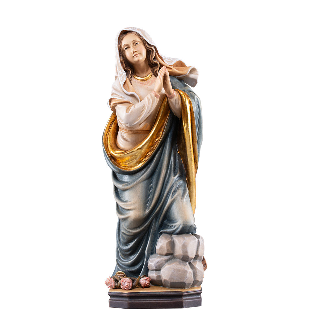 Heilige Rosalie mit Rosen sehr kunstvoll und detailreich aus Ahorn oder Lindenholz geschnitzt. Sie können die verschiedenen Oberflächen Ausführungen der Figur sowie die Größen auswählen. Diese Holzfigur ist kurzfristig lieferbar. Heiligenfiguren und Holzschnitzereien werden auch heute noch nach traditionellen Techniken hergestellt . Alle Figuren werden maschienell vorgefräst und von Hand nachgearbeitet. Nur so können die Figuren bezahlbar produziert werden. Bemalte Holzfiguren werden mit hochwertigen Ölfarben von Hand veredelt und teilweise mit Blattgold belegt. Gerne fertigen wir für Sie einen Sockel mit Wunschgravur