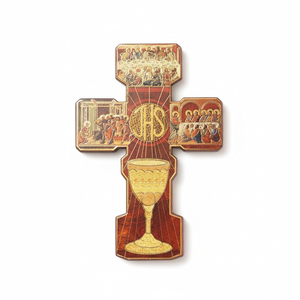 Dieses Kommunionkreuz mit Kelch und IHS ist ein klassisches Symbol der Erstkommunion. Das Kreuz aus Holz steht für Glauben und Gemeinschaft und ist eine schöne Geschenkidee zur Kommunion.