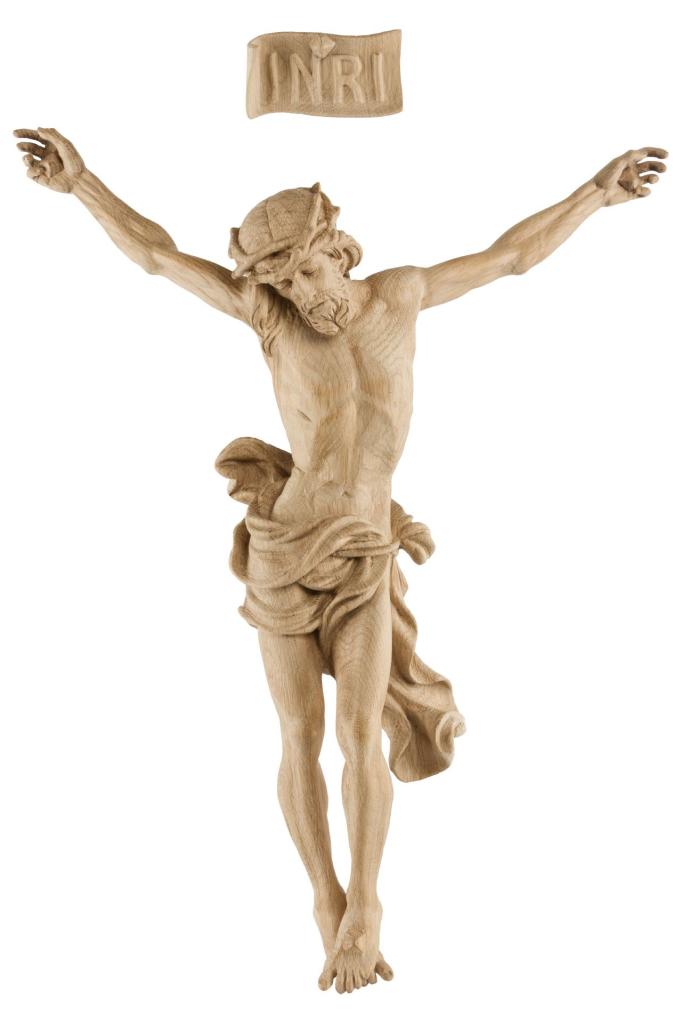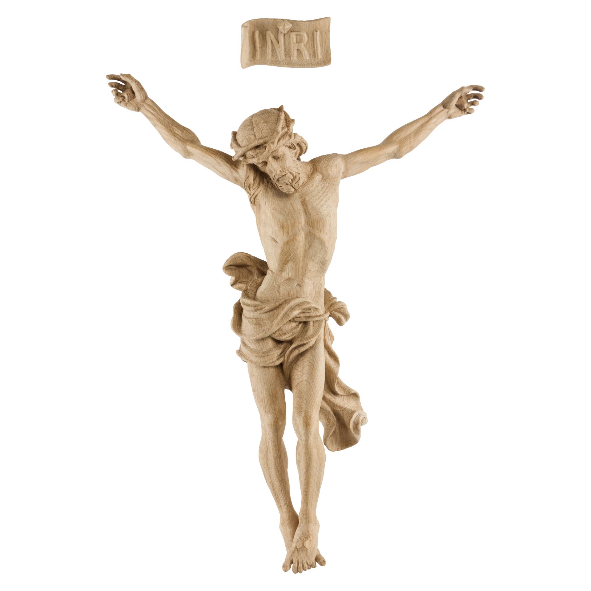 Barocker Christuskörper mit INRI Schild. Befestigt wird dieser Christuskörper von hinten mit einen Holzdübel oder Schraube. Bitte nicht an den Armen befestigen!