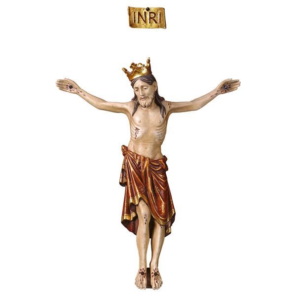 Corpus Romanisch mit Krone und Inri Schild sehr kunstvoll und detailreich aus Ahornholz geschnitzt. Christuskörper und Holzkreuze werden auch heute noch nach traditionellen Techniken hergestellt. Bemalte Holzschnitzereien werden mit hochwertigen Ölfarben von Hand veredelt und teilweise mit Blattgold belegt Der Christuskörper wird von Kopf Oberkante bis Zehenspitze gemessen.