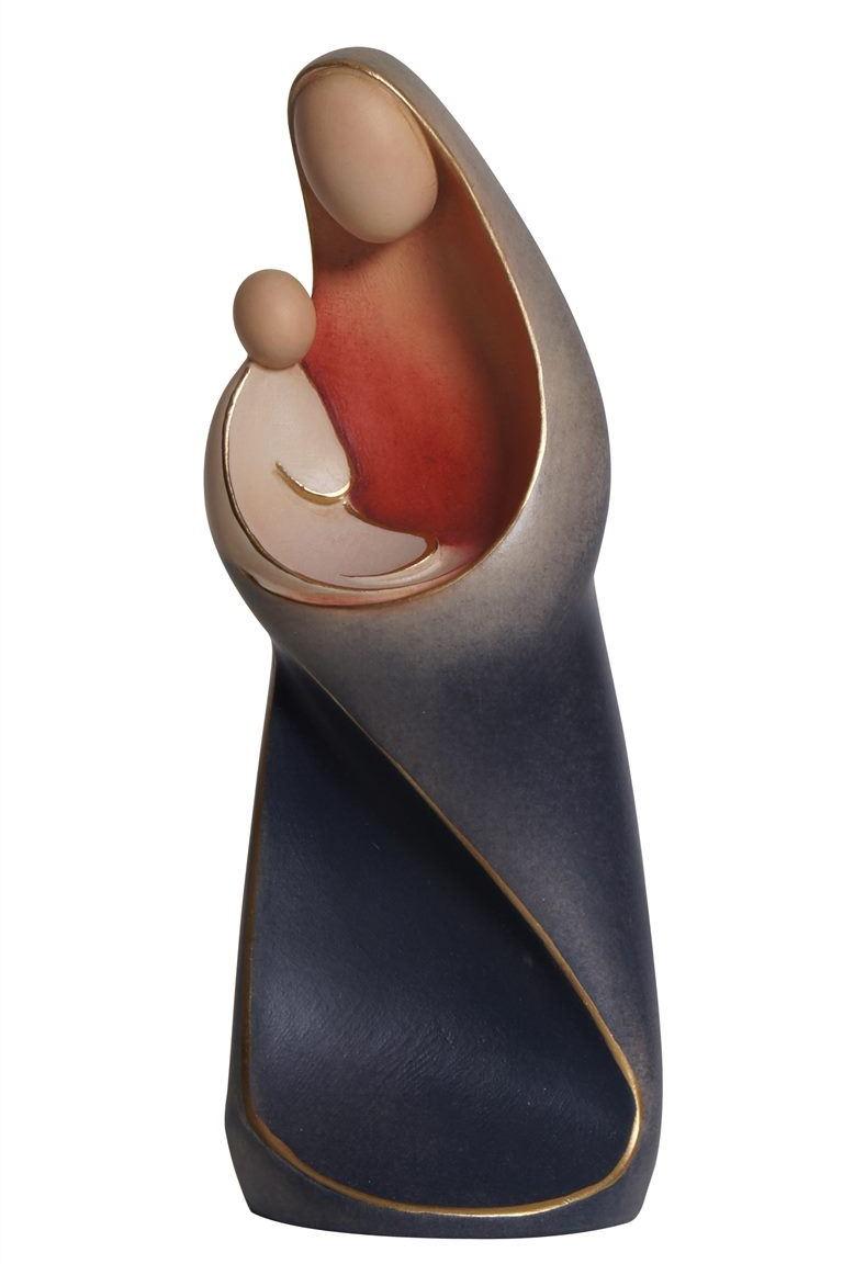 Die moderne geschnitzte La Madonna hält ihr Kind liebevoll in beiden Armen und blickt es freudestrahlend an. Die Figur wurde sehr dezent coloriert