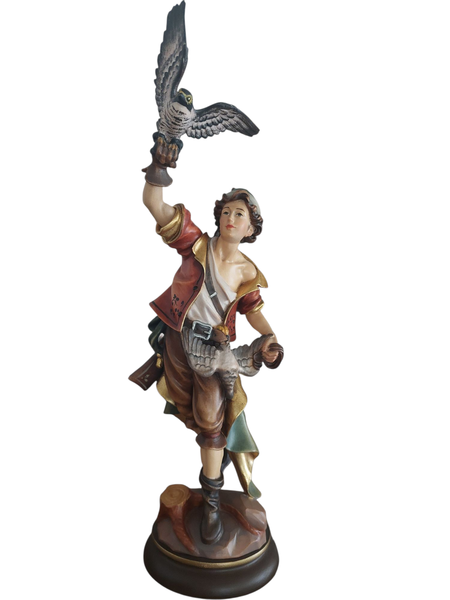 Der Falkner ist stolz und ruhig mit einem Greifvogel auf seiner Hand. Er trägt einen dicken Lederhandschuh und ist traditionell gekleidet mit einem breiten Gürtel. Der Gesichtsausdruck des Falkners ist konzentriert, zwischen Mensch und Tier scheint eine stille Verbindung zu bestehen, die auf gegenseitiges Vertrauen beruht. Die filigran geschnitzte Figur in Ahornholz und mit Ölfarben bemalt ist eine besondere Darstellung und Geschenkidee.