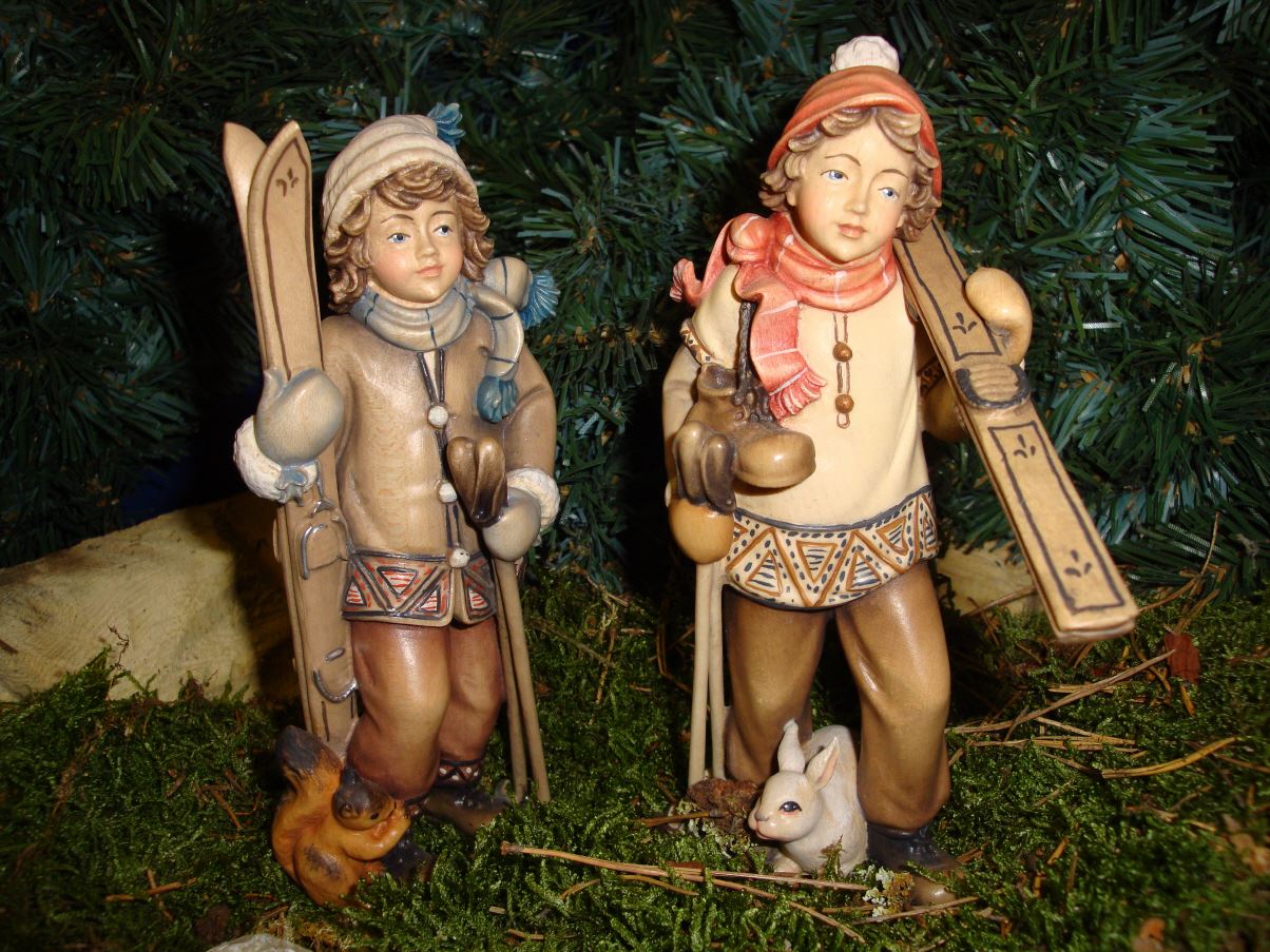 Schöne Kindersportfigur Mädchen mit Ski und Eichhörnchen am Beinende aus Ahornholz geschnitzt. Ideales Geschenk für einen Skifahrer.