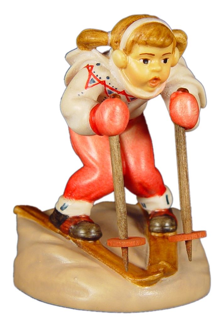 Eine liebevoll geschnitzte Holzfigur stellt eine junge Skifahrerin in nostalgischer Erscheinung dar. Das Mädchen trägt warme Ohrenschützer und einen Pullover im traditionellen Norwegermuster, was ihr einen skurril - verspielten Charme verleiht. In leicht geduckter Haltung, bereit zur Abfahrt, steht sie fest auf seinen Holzskiern. In den Händen hält sie passende Stöcke, die die abfahrtsbereite Pose unterstreichen. Die Figur ruht auf einem geschnitzten Schneeberg, der die winterliche Szenerie abrundet und den Eindruck einer kleinen nostalgischen Winterszene vermittelt. Eine schöne Dekoration für den Winter.