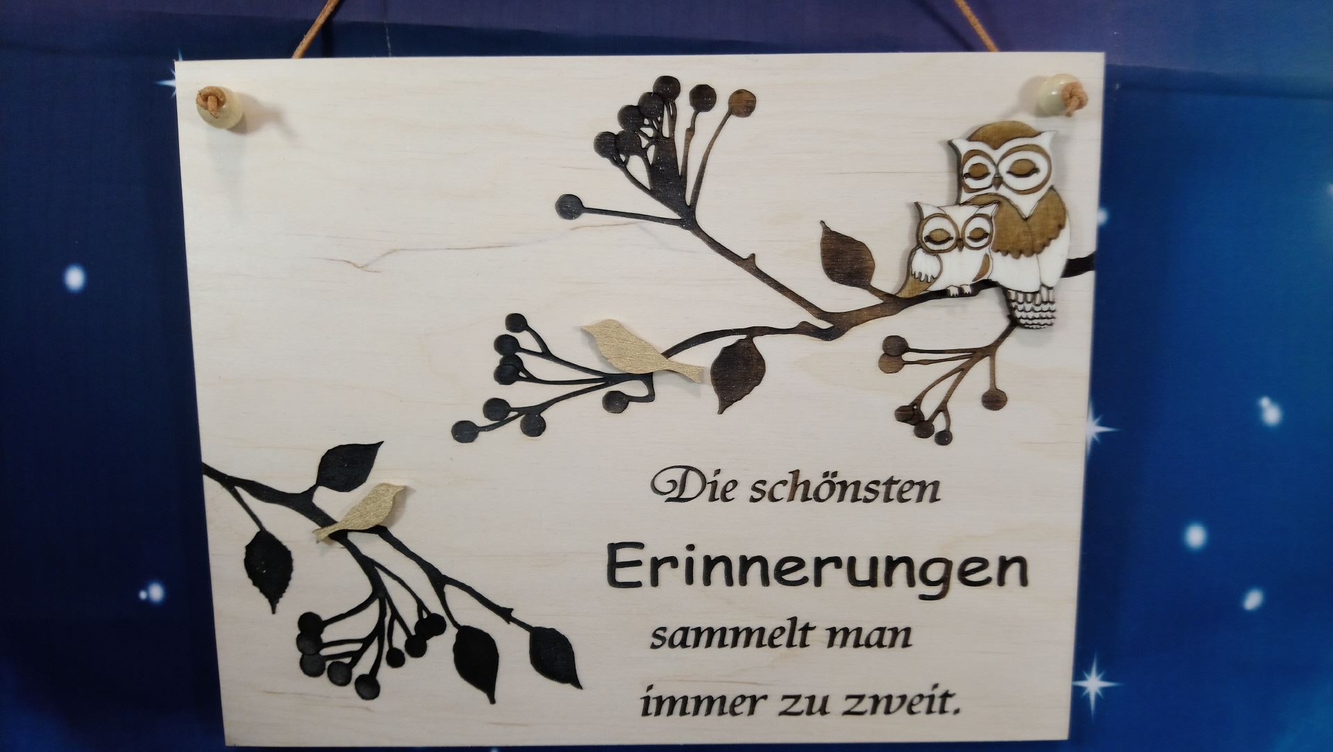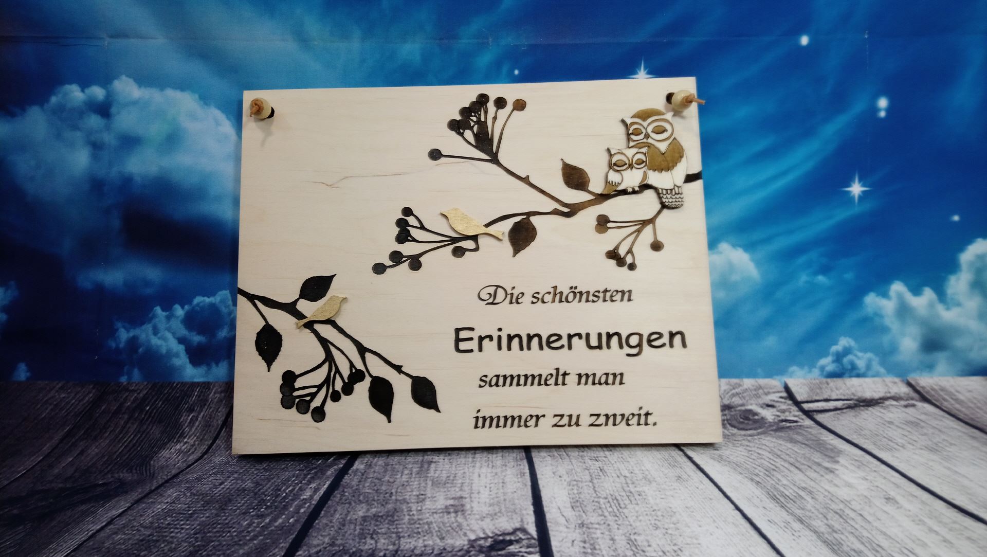 Holztafel .Die schönsten Erinnerungen sammelt man immer zu zweit als dekorativer Wandschmuck Maße der Holztafel ca. H 16 cm - Breite 200 cm, Dicke 15 mm Holzschild mit Vögel und Eulenpaar