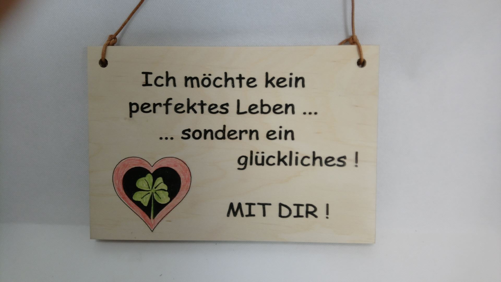 Holztafel :Ich möchte kein perfektes Leben sondern ein glückliches mit Dir als dekorativer Wandschmuck Maße der Holztafel ca. H 16 cm - Breite 200 cm, Dicke 15 mm Holzschild mit Vögel und Eulenpaar