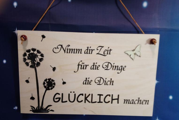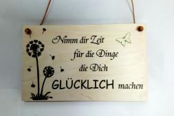 Holztafel „Pusteblume“ als dekorativer Wandschmuck Maße der Holztafel ca. H 16 cm - Breite 200 cm, Dicke 15 mm Holzschild Nimm dir Zeit für die Dinge die dich glücklich machen Holzbild zum aufhängen mit gravierten Spruch