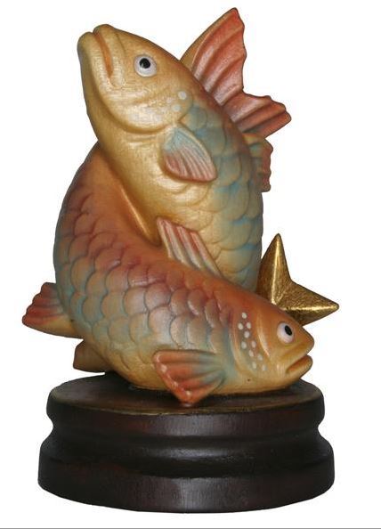 Sternzeichen Fische aus Ahornholz geschnitzt und in der Ausführung Color mit Ölfarben handbemalt. Ausdrucksstarke Holzschnitzerei in bester Qualität. Der Fisch und seine Charaktereigenschaften im Überblick Der typische Fisch ist charmant, einfühlsam, empfindsam, feinfühlig, fröhlich, geheimnisvoll, geduldig, gesellig, grosszügig, hilfsbereit, hingabefähig, innig, inspirierend, intuitiv, medial, mitfühlend, mitleidend, mystisch, phantasievoll, romantisch, schillernd, seelenvoll, selbstlos, sensibel, sentimental, verständnisvoll und verträumt. Schwächen: ängstlich, beeinflussbar, chaotisch, disziplinlos, entscheidungsschwach, gehemmt, labil, prinzipienlos, sentimental, überempfindlich, umständlich, unfassbar und unzuverlässig. Lebensmotto: Ich fühle mich mit allem verbunden! Ich glaube!